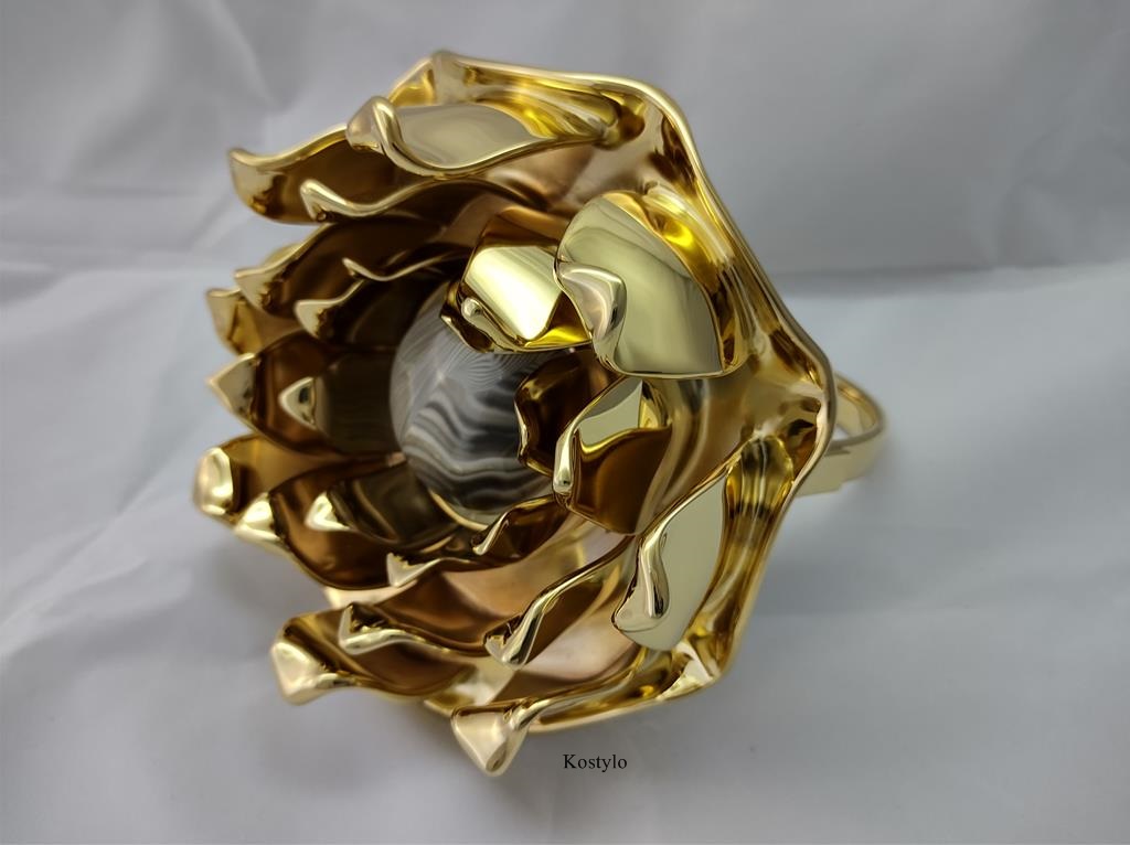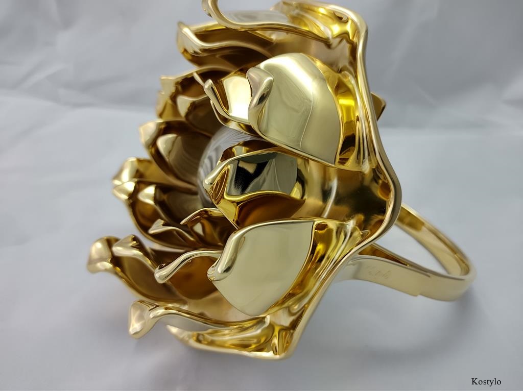 The luxurious lotus flower ring sculpture is plated with 23-karat Italian gold. This piece was created entirely from an original design to the final work in the Kostylo atelier.
