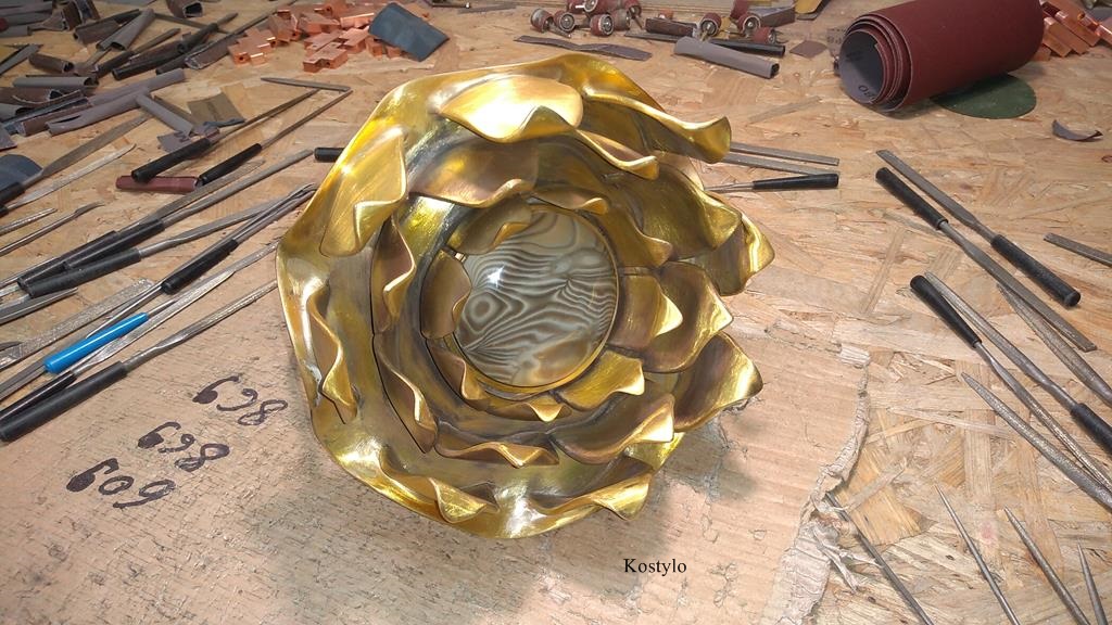 We used a similar process to craft the luxurious lotus flower base, heating the brass sheet to very high temperatures and then manually forming eight lotus petals. We soldered the primary part and center of the lotus flower, where a beautiful, rare semi-precious striped flint stone would be set. As seen in the photo, this base was intricately hand-grinded.