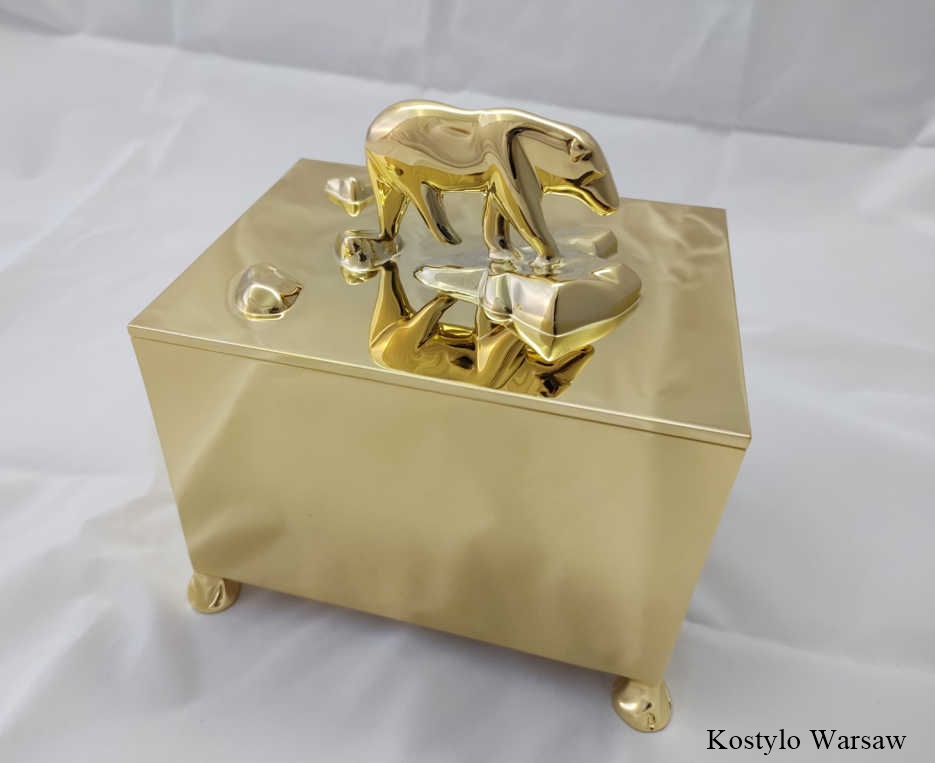 High-quality luxurious golden box with a polar bear figurine, perfect for jewelry and as a luxurious gift, designed and handmade by Kostylo atelier
