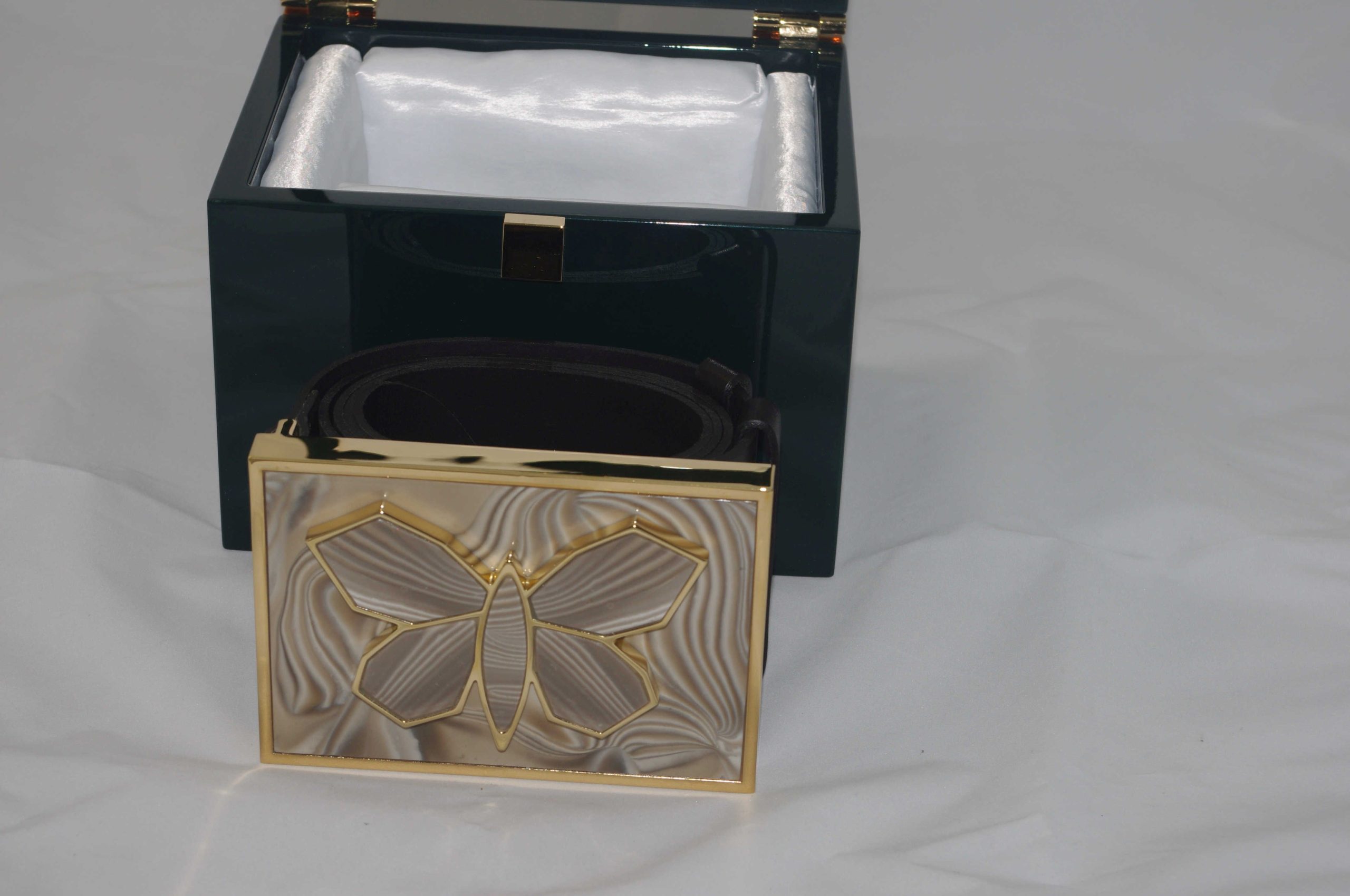 The luxurious butterfly buckle belt is an extraordinary accessory for pants and dresses. This unique and rare belt is made of high-quality brass, plated with 23-karat gold, and adorned with a carefully selected rare striped flint gemstone. Every detail of the butterfly wings has been thoughtfully designed to create a stunning and elegant composition.