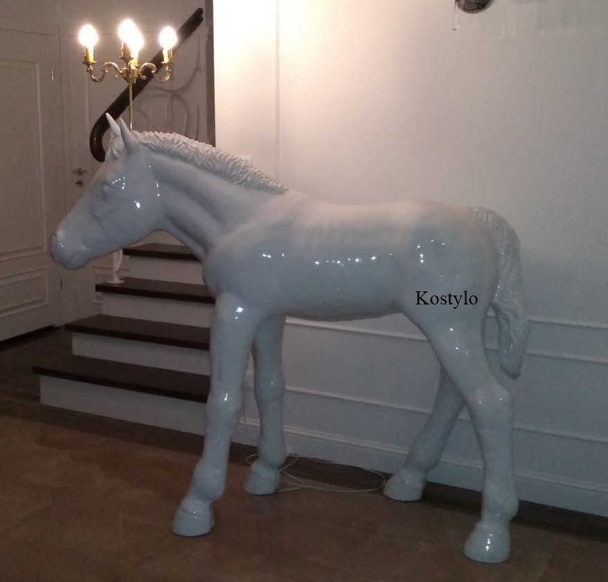 This captivating life-sized sculpture of a foal horse has been crafted from resin and intricately painted in pure white. Inside the sculpture, a discreetly placed cable allows for the installation of a four-armed chandelier directly above the horse’s head. The meticulous craftsmanship behind this sculpture, created in Kostylo Warsaw’s workshop, embodies artisanal excellence.