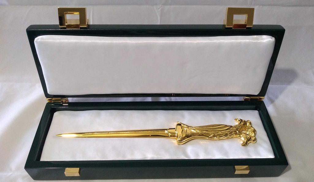 I present to you a luxurious figurative letter opener - a true masterpiece that captivates with its elegance and meticulous craftsmanship. This unique letter opener, gold-plated and adorned with the heads of imperial eagles, is not only a practical tool for opening letters but also a genuine work of art.