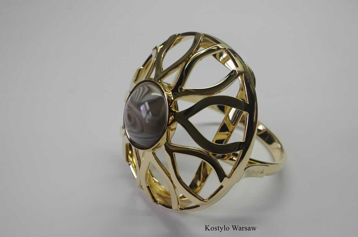 Our luxury collection presents a beautiful big gilded ring with a striped flint lotus-shaped gemstone. This large ring is a true masterpiece handcrafted by Kostylo, a manufacturing atelier that places a strong emphasis on precision and attention to detail.